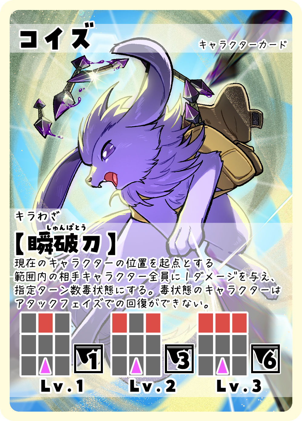 自慢の毒を仕込んだクナイで、遠距離から不意打ちするわざ。レベルで攻撃範囲が拡大し、毒の持続時間が伸びる!